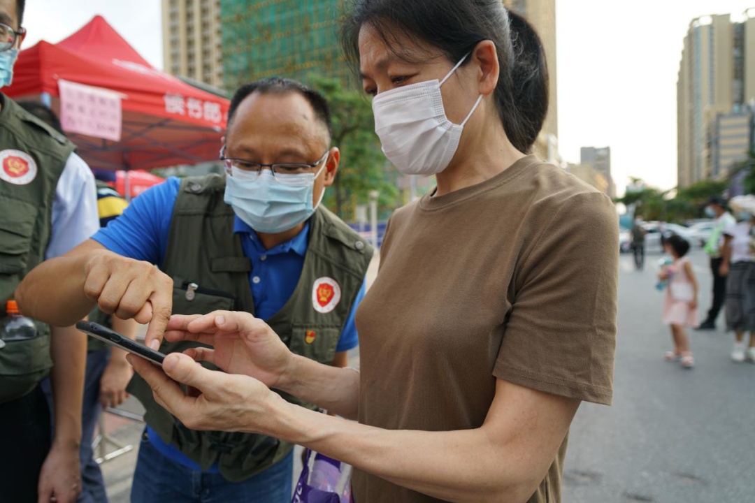 退役軍人志愿者協(xié)助前來進行核酸檢測的市民登記信息。(攝影:李盛歡) 退役軍人志愿者們按照分工安排,提供維持秩序、檢查粵康碼、測量體溫、協(xié)助前來檢測的市民登記信息等服務(wù)。在志愿者們的引導(dǎo)下,現(xiàn)場秩序井然,檢測工作快速高效。