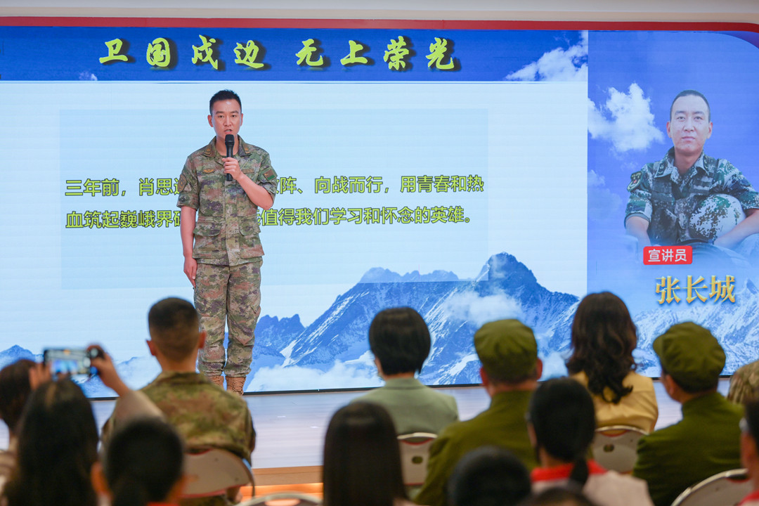 張長城:肖思遠(yuǎn)的名字永遠(yuǎn)留在連隊(duì) “我是69316部隊(duì)加勒萬邊防連‘肖思遠(yuǎn)班’班長張長城,很高興今天有機(jī)會跟大家進(jìn)行交流。三年前,肖思遠(yuǎn)班長兩闖敵陣、向戰(zhàn)而行,用青春和熱血筑起巍峨界碑,是永遠(yuǎn)值得我們學(xué)習(xí)和懷念的英雄……” 張長城現(xiàn)場作了主題為《衛(wèi)國戍邊 無上榮光》的宣講。 張長城說—— 肖班長犧牲后,連隊(duì)組建了“肖思遠(yuǎn)班”,班里有一張肖班長的床,每天晚上,戰(zhàn)士們都會將肖班長的被子打開,早上起床再將被子工工整整的疊好;晚上點(diǎn)名,班里的同志輪流向肖班長匯報(bào)本班和個(gè)人的工作。 連隊(duì)每天的點(diǎn)名,呼點(diǎn)的第一個(gè)名字永遠(yuǎn)是“肖思遠(yuǎn)”,全連齊聲答“到、到、到”,那一刻,感覺下面所有人,望過去都是他! ▌與現(xiàn)場基層干部群眾互動交流