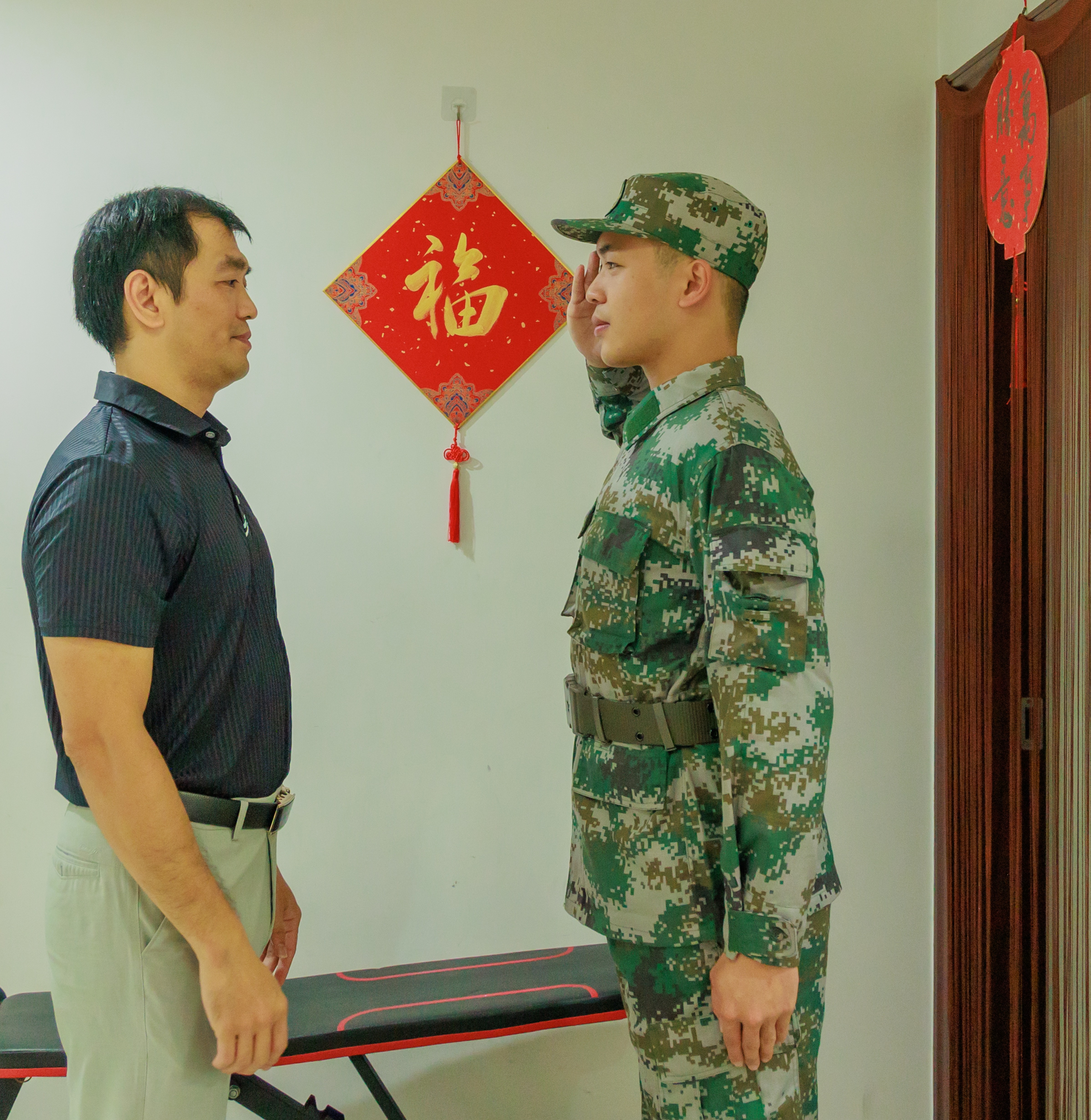 “我將把五彩的夢(mèng)想交給迷彩去儲(chǔ)藏……”9月8日,中山市東區(qū)街道舉行2023年下半年入伍青年歡送座談會(huì),新兵代表?xiàng)钌辛丶?dòng)地說(shuō)。楊尚霖現(xiàn)已領(lǐng)取入伍通知書,并前往中山市國(guó)防教育基地開展役前訓(xùn)練,幾天后將啟程前往部隊(duì)服役。 楊尚霖給父親敬禮。馬衛(wèi)星 攝