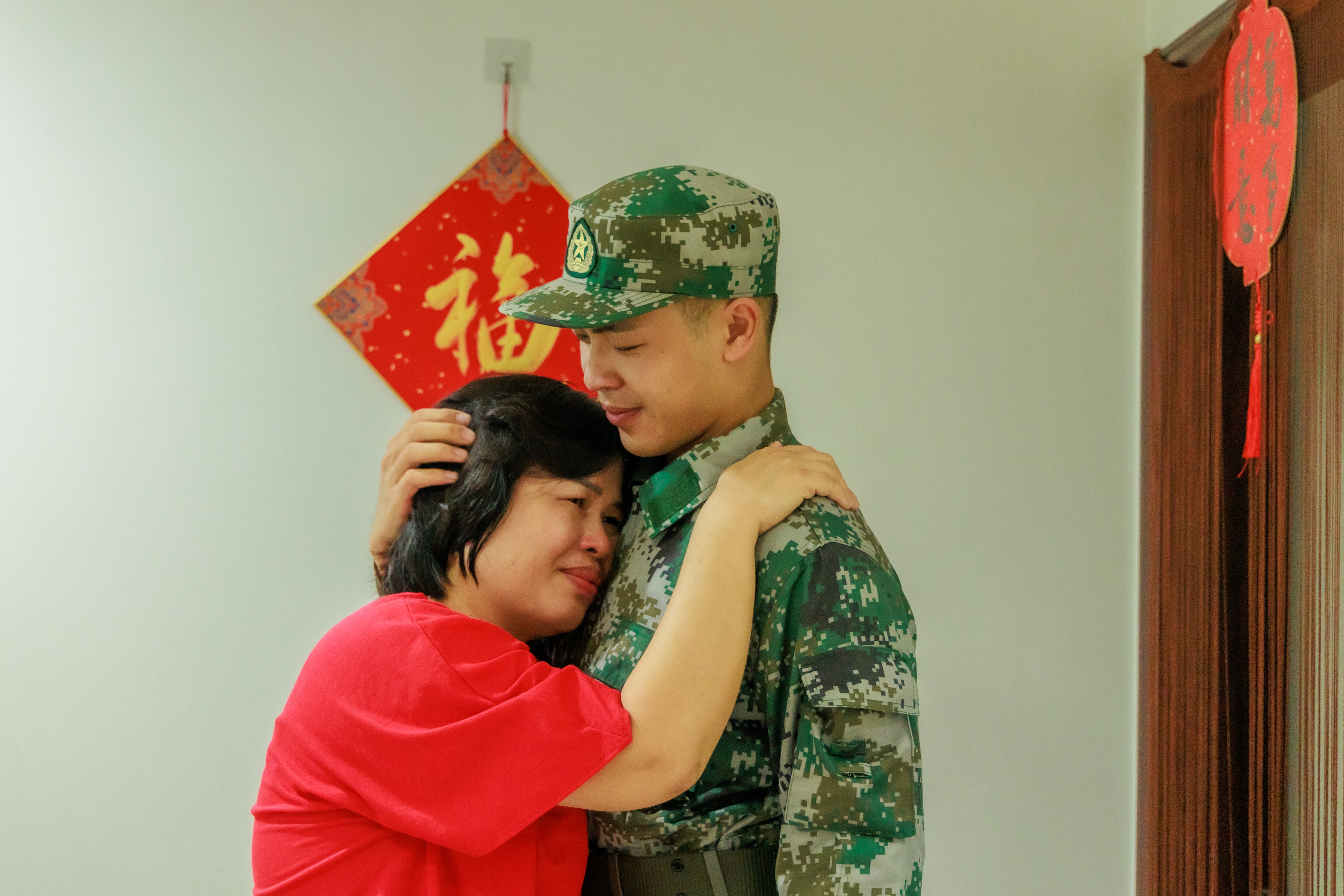 楊尚霖與母親惜別。馬衛(wèi)星 攝 2002年出生的楊尚霖來自東區(qū)街道東裕社區(qū)。小時(shí)候,楊尚霖就跟著家里人看抗戰(zhàn)、軍旅題材的電視劇。耳濡目染之下,他羨慕軍人擁有鋼鐵般的意志。他的外公是一名退役軍人,老人家最大的愿望便是4個(gè)孫子中有人能夠參軍報(bào)國。外孫楊尚霖是家中最小的,3個(gè)哥哥因種種原因都遺憾無緣軍營。外公將后輩的從軍夢(mèng)寄托在了楊尚霖身上。