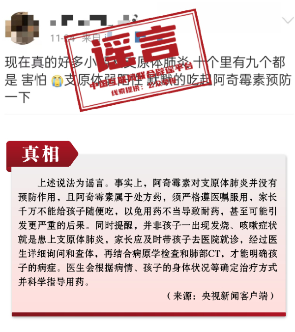 謠言2:可自行給兒童服用阿奇霉素,以預(yù)防支原體肺炎?