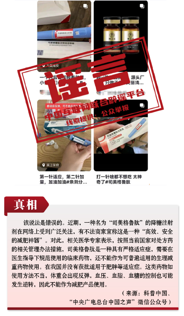 有關(guān)呼吸道疾病防治的謠言和誤區(qū)誤導(dǎo)公眾。隨著各地陸續(xù)入冬,呼吸道疾病進(jìn)入高發(fā)季節(jié),多種呼吸道疾病交織疊加,難免讓人焦慮。恰在此時(shí),網(wǎng)上一些治病養(yǎng)生醫(yī)藥“偏方”頻出,一些自媒體假借專業(yè)人士和醫(yī)生網(wǎng)上“開方”,真假難辨、誤導(dǎo)公眾。如“感染肺炎支原體會(huì)得肺炎、會(huì)出現(xiàn)‘白肺’”“可自行給孩子服用阿奇霉素等藥物以預(yù)防支原體肺炎”“可網(wǎng)上購買‘醫(yī)院同款’霧化器在家自療”等謠言,抓住人們對(duì)疾病的恐懼心理大肆傳播,有的耽誤正常治療,有的則是“假科普、真帶貨”。此外,“使用司美格魯肽能輕松減肥”的謠言,無視權(quán)威部門對(duì)處方藥的相關(guān)管理辦法措施,此類藥品若盲目使用或者使用不當(dāng),存在很大健康風(fēng)險(xiǎn)。