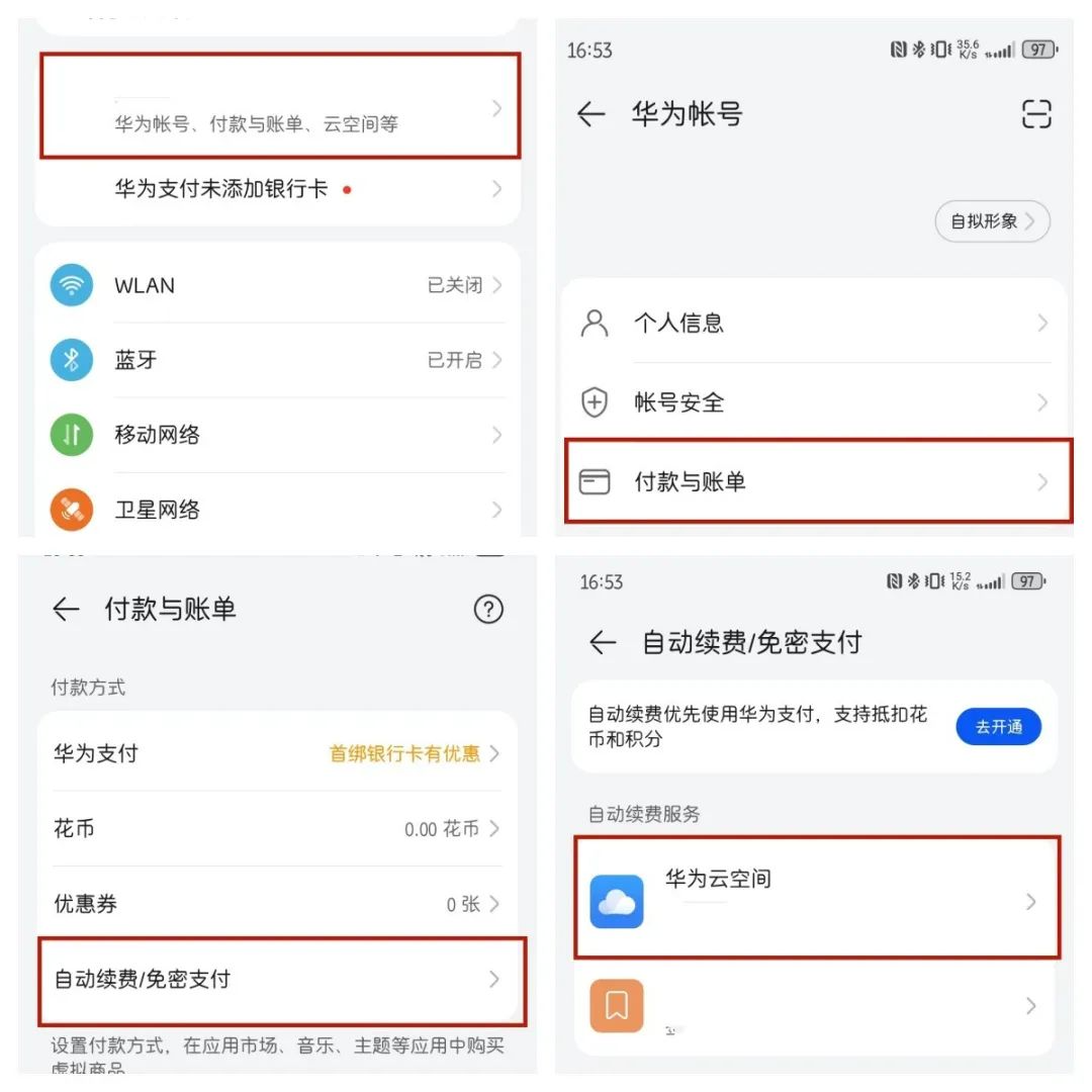 進(jìn)入設(shè)置→華為賬號、付款與賬單、云空間等→付款與賬單→自動續(xù)費/免密支付→退訂App業(yè)務(wù)即可。