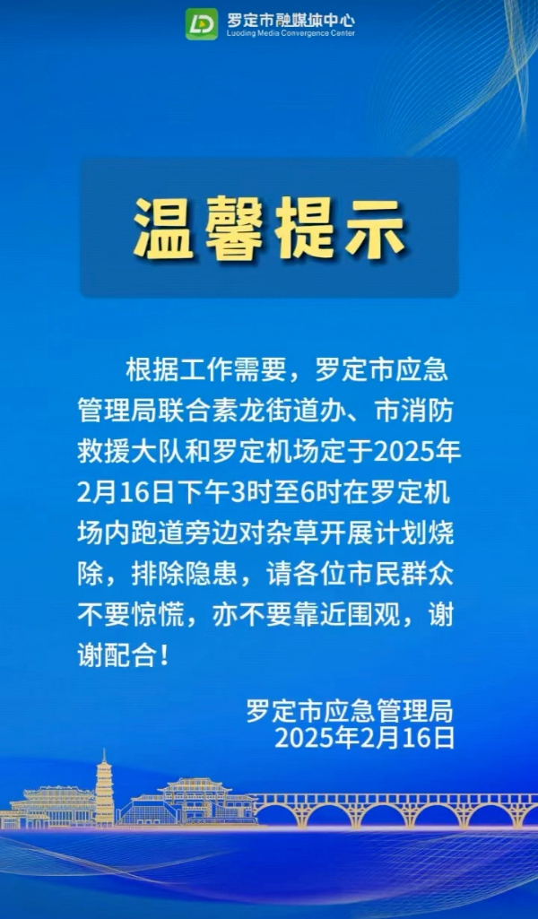 記者查詢發(fā)現(xiàn),羅定市融媒體中心曾于2月16日發(fā)布一則提示,明確表示羅定機(jī)場(chǎng)將于2025年2月16日下午3時(shí)至6時(shí),在跑道旁開展雜草燒除工作,并提醒市民不必驚慌。