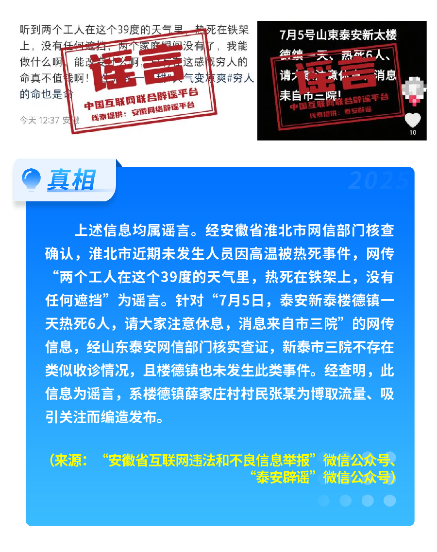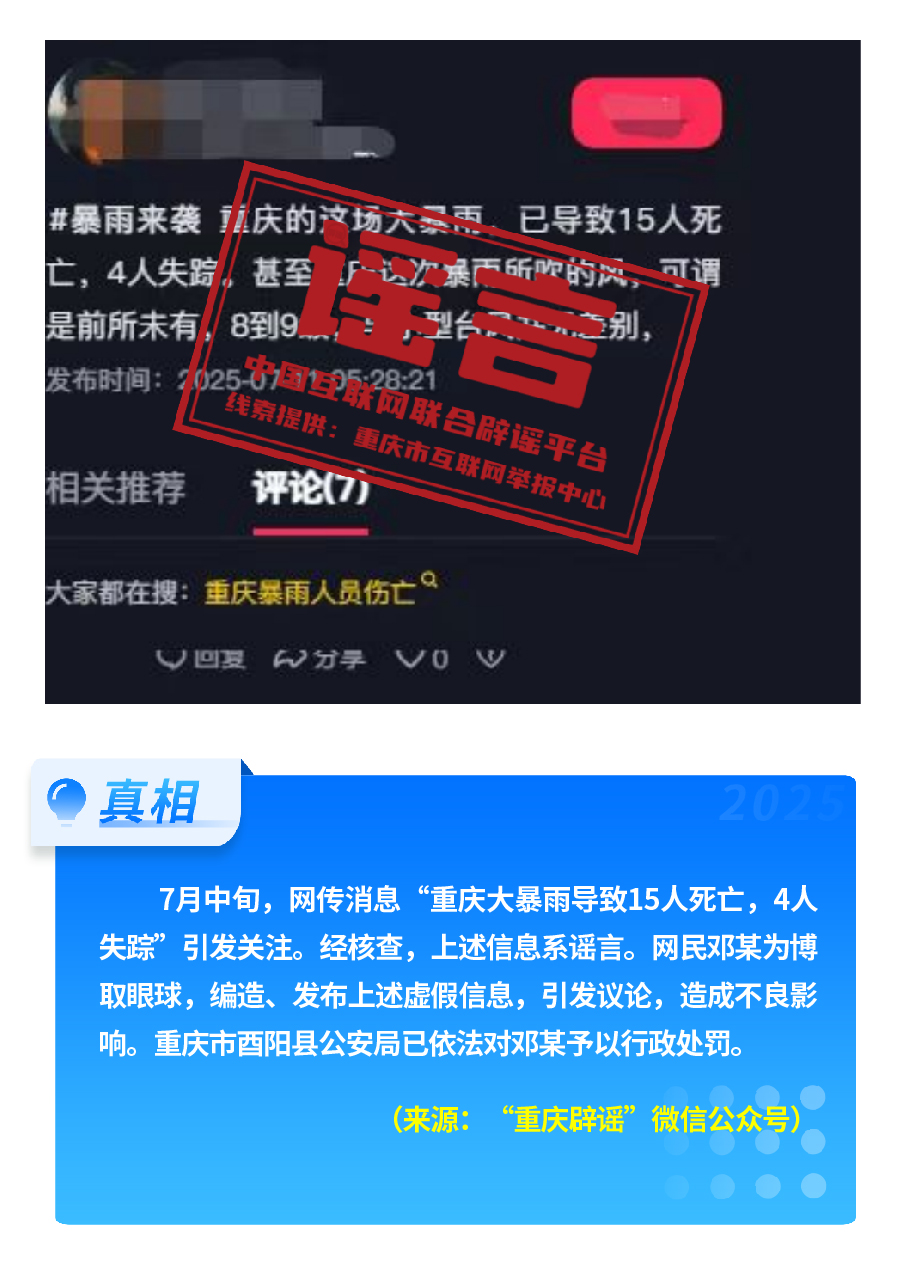 近期,網(wǎng)上接連出現(xiàn)發(fā)布虛假“警情通報(bào)”的惡性造謠傳謠案件,炮制傳播“昆明駕車撞人案131人死亡”“杭州自來水接入糞水”及涉釋永信虛假“警情通報(bào)”,模仿“藍(lán)底白字”格式,杜撰聳人聽聞細(xì)節(jié),損害政府公信力,嚴(yán)重?cái)_亂社會秩序。“院士預(yù)測廣東將發(fā)生8級以上大地震”公然偽造專家聊天截圖,謊報(bào)地震預(yù)警。還有造謠者借盛夏高溫酷暑與洪澇災(zāi)害,編造“安徽淮北、山東泰安等地多人因高溫死亡” “重慶大暴雨導(dǎo)致15人死亡、4人失蹤”等謠言,蹭炒熱點(diǎn)、煽動情緒。