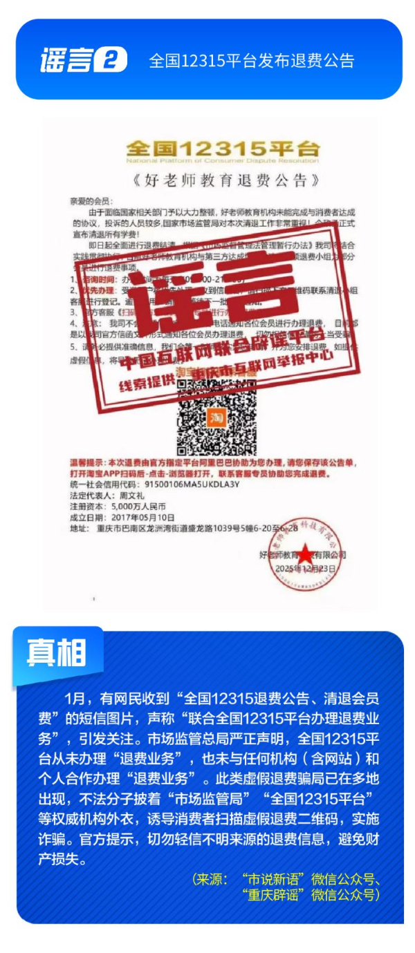 公共政策領(lǐng)域謠言誤導公眾決策。“社??]有有效期限制、未到期不能換新卡”是對社保卡管理政策的誤讀,給民眾平添困擾;“28家博物館元旦期間閉館”實為少數(shù)博物館根據(jù)運營安排所做的微調(diào),網(wǎng)帖嚴重夸大實際閉館情況,引發(fā)負面炒作;“深圳有望推行12年義務教育,高中免費”是對現(xiàn)行政策的“超前編造”,誤導學生及家長群體;“全國12315平臺發(fā)布退費公告”,則是假冒監(jiān)管機構(gòu)名義散播不實通知,為后續(xù)詐騙行為做鋪墊。