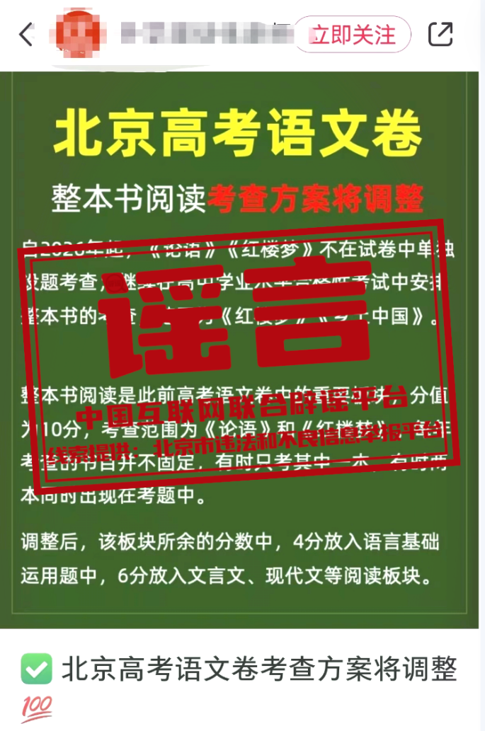 真相:近日,關(guān)于“北京高考語文學(xué)科整本書閱讀考查方式調(diào)整”的消息在網(wǎng)絡(luò)上傳播,引發(fā)社會發(fā)注。對此,北京教育考試院發(fā)表聲明稱:該網(wǎng)傳內(nèi)容為不實(shí)信息。北京教育考試院沒有發(fā)布對北京高考語文整本書閱讀考查方式調(diào)整的相關(guān)內(nèi)容,北京高考語文2025、2026年的學(xué)科考試內(nèi)容保持穩(wěn)定,范圍不變。(來源:北京市違法和不良信息舉報(bào)平臺、“首都教育”微信公眾號)